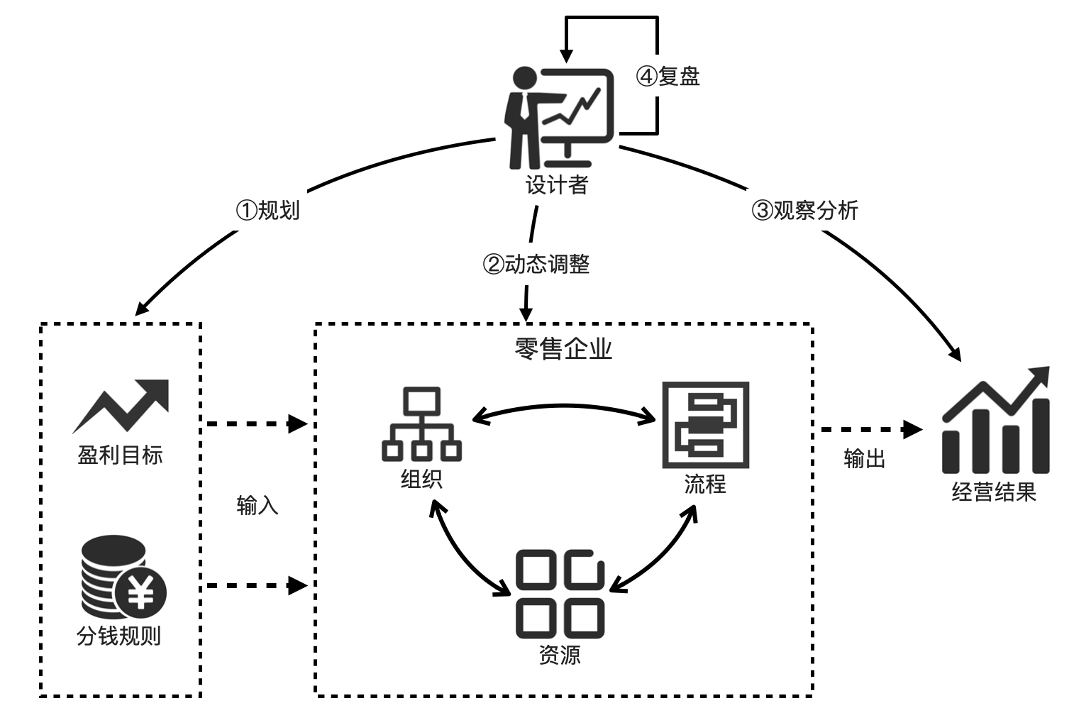 分钱规则:所有零售企业的财务目标都是赚钱,赚完钱要按照事前定好的分钱规则,给组织各团队分钱,这样才能保障机器正常运转,不然机器就罢工了。