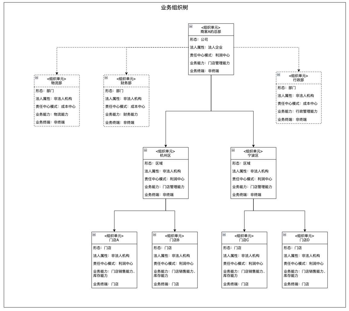 组织单元的业务终端属性:如果组织单元是业务终端,一是代表该节点是组织树的叶子节点,二是代表该节点直接从事一线的业务活动。业务终端的典型形态就是门店、电商网店、配送中心。