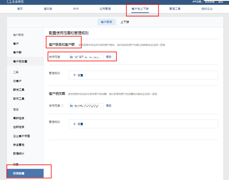 6)是否给员工配置了【客户联系】的权限,登陆【企业微信官方后台】-【客户与上下游】-【权限配置】-【客户联系与客户群】里面配置下使用范围,添加员工。