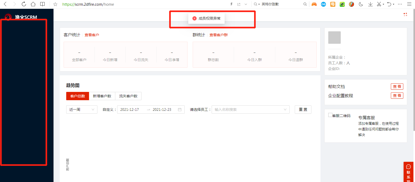 1. 登录渔火后台,出现提示“成员权限异常”,且侧边功能栏不显示
