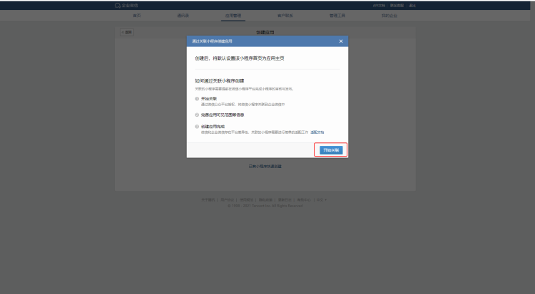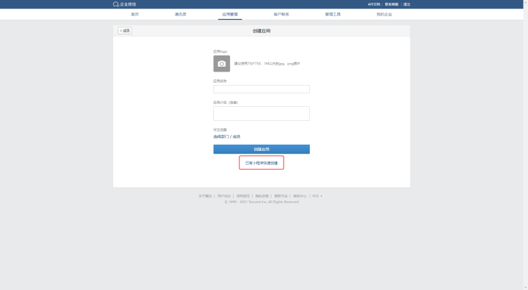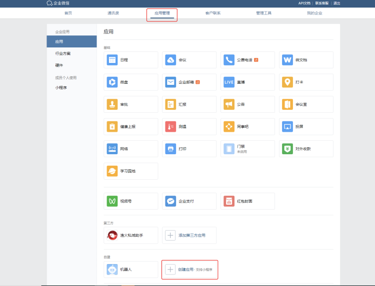a. 登陆企业微信官方后台,打开【应用管理】在【自建】下点击创建应用。