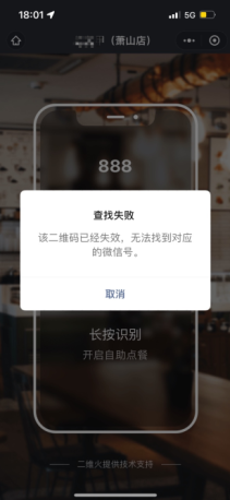 3. 顾客扫企微点餐吸粉码提示“该二维码已经失效,无法找到对应的微信号”是什么原因?如下图提示