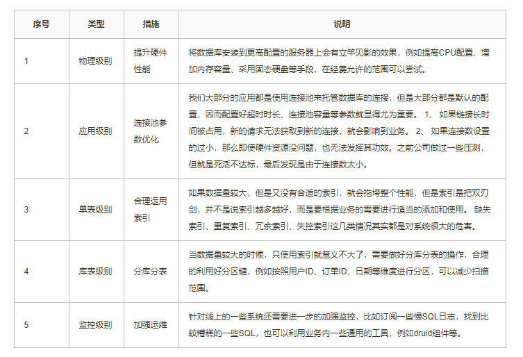 数据库性能优化的常见手段有很多,比如添加索引、分库分表、优化连接池等,具体如下: