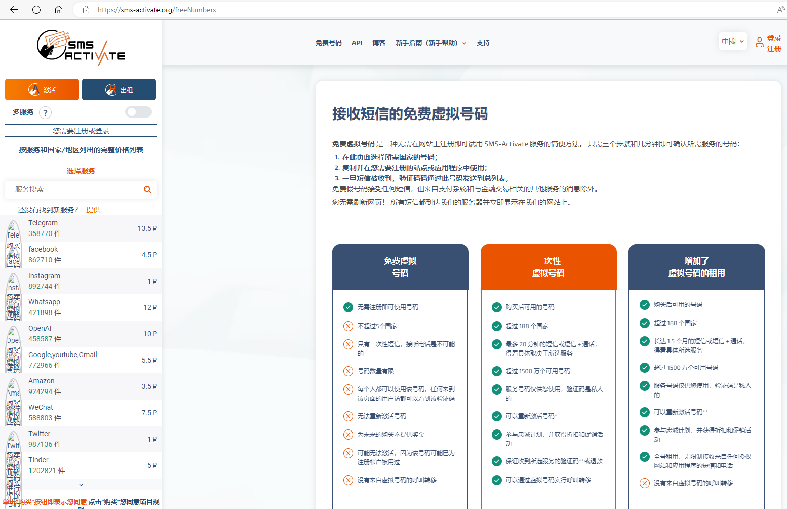 点击:免费虚拟号码, 在线接收短信 - SMS-Activate