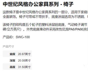 在描述之后,包括一个表格,提供产品的尺寸。表格应该有两列。第一列包括尺寸的名称。第二列只包括英寸的测量值。