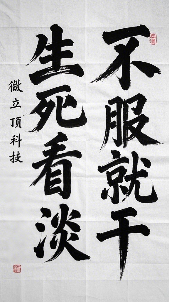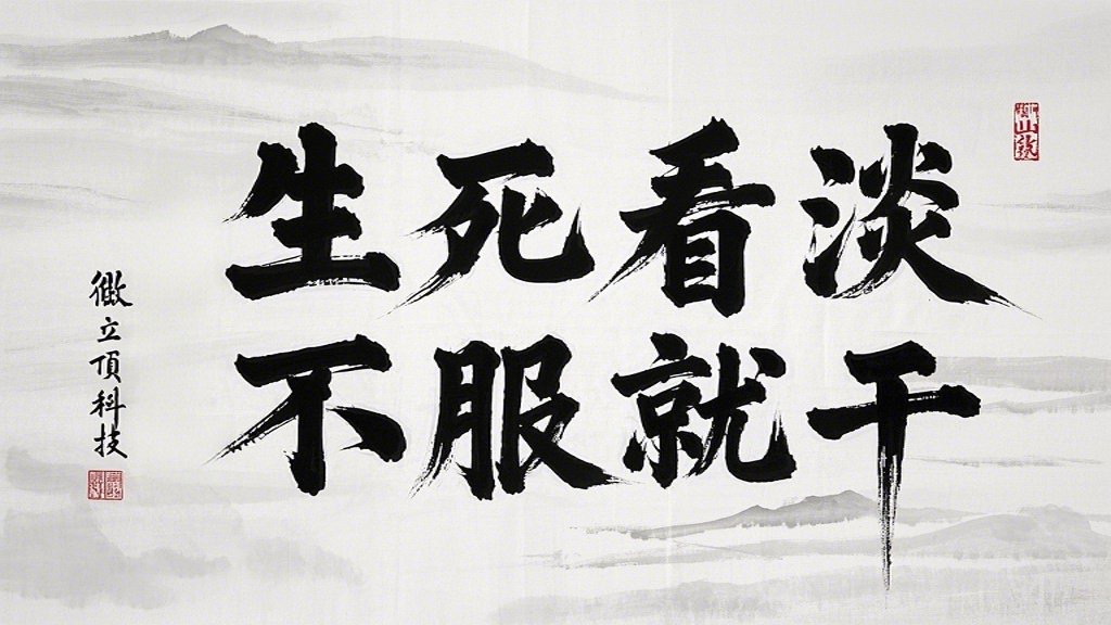 在洁白如雪的宣纸上,书法家以豪放洒脱的行楷笔法分成两个竖排写下 “生死看淡,不服就干” 八个大字。每个字都力透纸背,笔画粗壮有力,犹如蛟龙出海,气势磅礴。墨色浓淡相宜,“生” 字起笔凌厉,“死” 字收笔沉稳,“看” 字笔画舒展,“淡” 字结构端庄。“不” 字一气呵成,“服” 字刚柔并济,“就” 字笔势连贯,“干” 字收尾果断。落款放在左边竖排,小楷汉字“微立顶科技”。