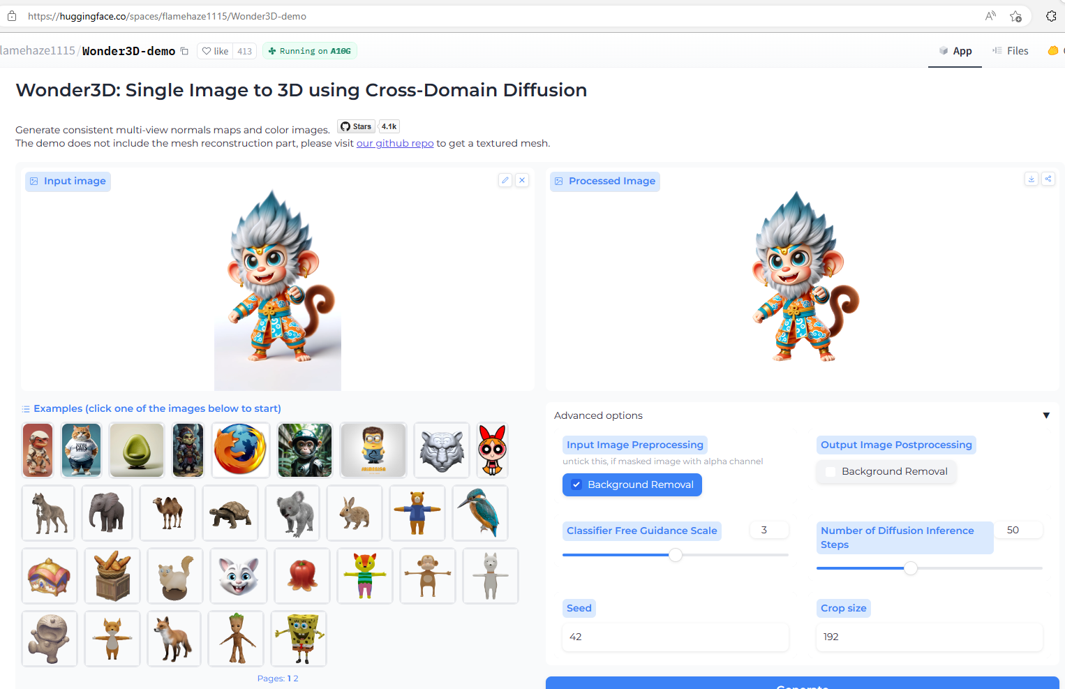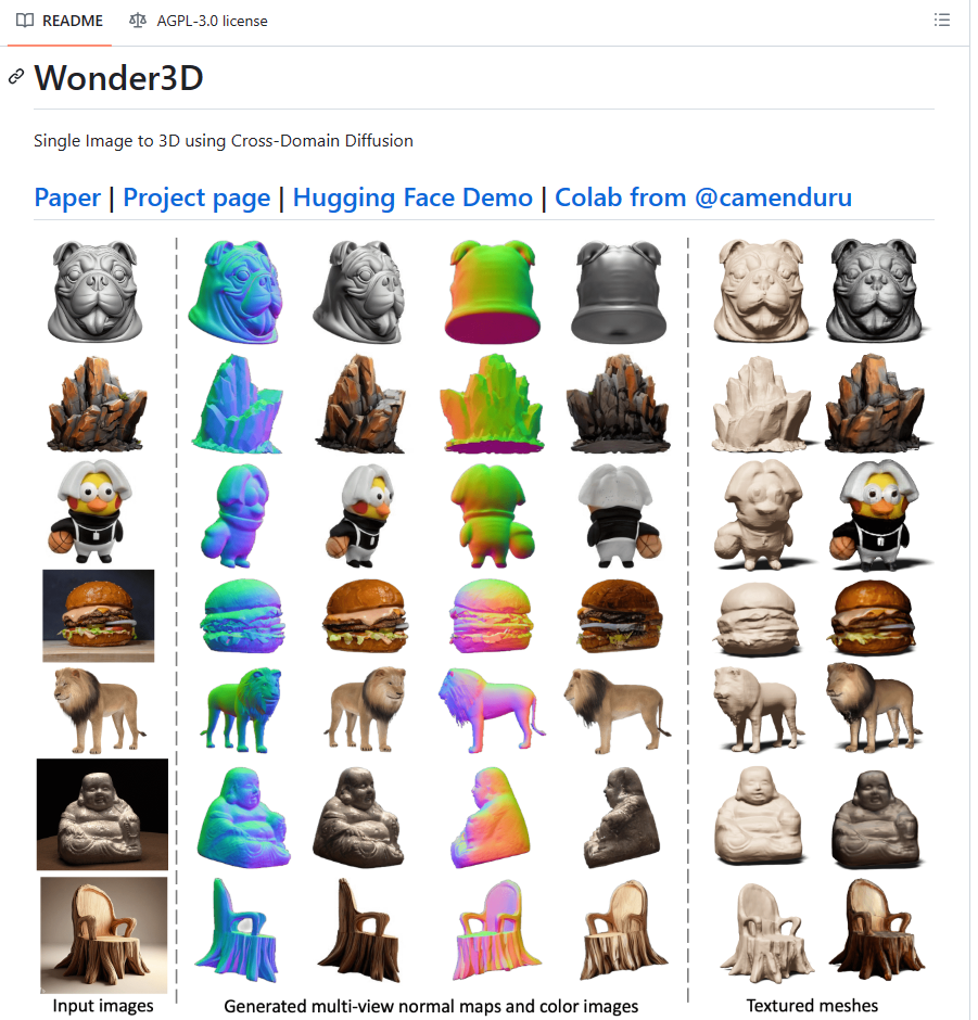 Wonder3D 只需 2 ∼ 3 分钟即可从单视图图像重建高度详细的纹理网格。Wonder3D首先通过跨域扩散模型生成具有相应颜色图像的一致多视图法线贴图,然后利用一种新颖的法向融合方法实现快速、高质量的重建。