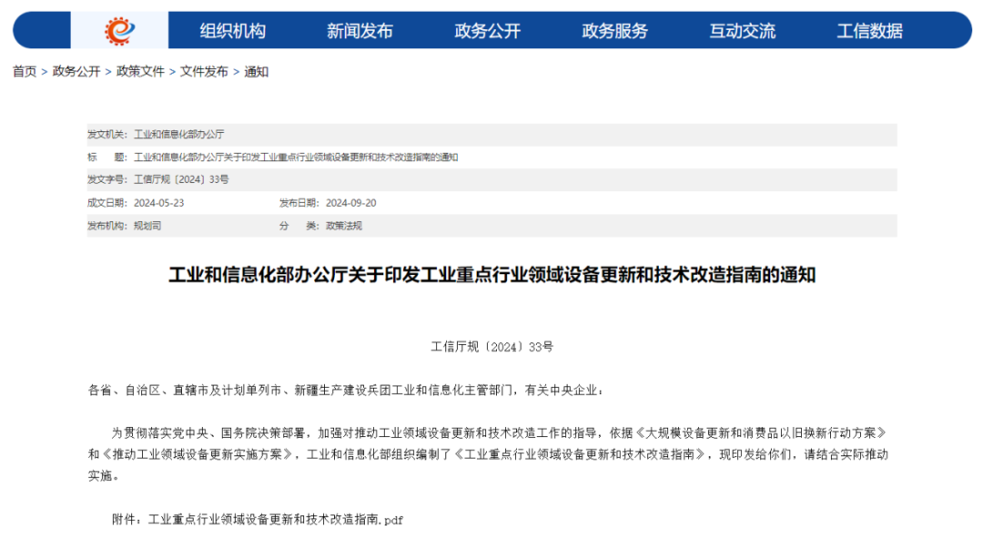 9月20日最新消息,为贯彻落实党中央、国务院决策部署,加强对推动工业领域设备更新和技术改造工作的指导,依据《大规模设备更新和消费品以旧换新行动方案》和《推动工业领域设备更新实施方案》,工业和信息化部组织编制了《工业重点行业领域设备更新和技术改造指南》。