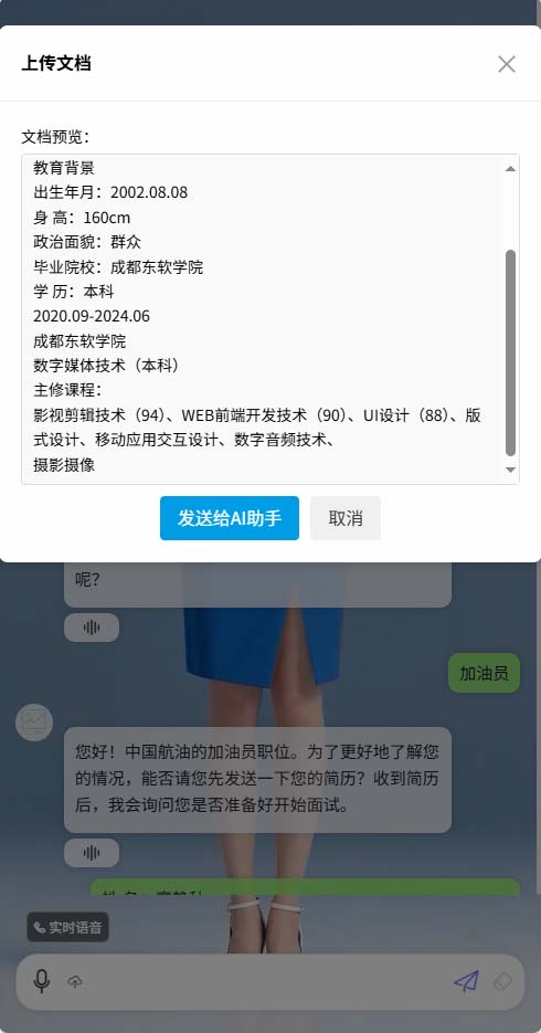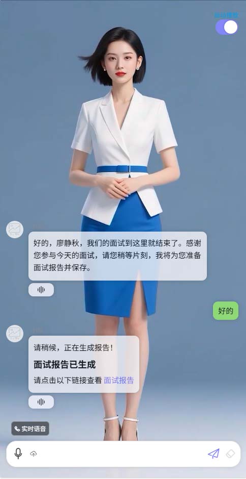 面试训练陪练AI实时数字人效果,针对工作前的面试,可以采用AI数字人方式进行面试模拟和改进,并且生成面试结果报告