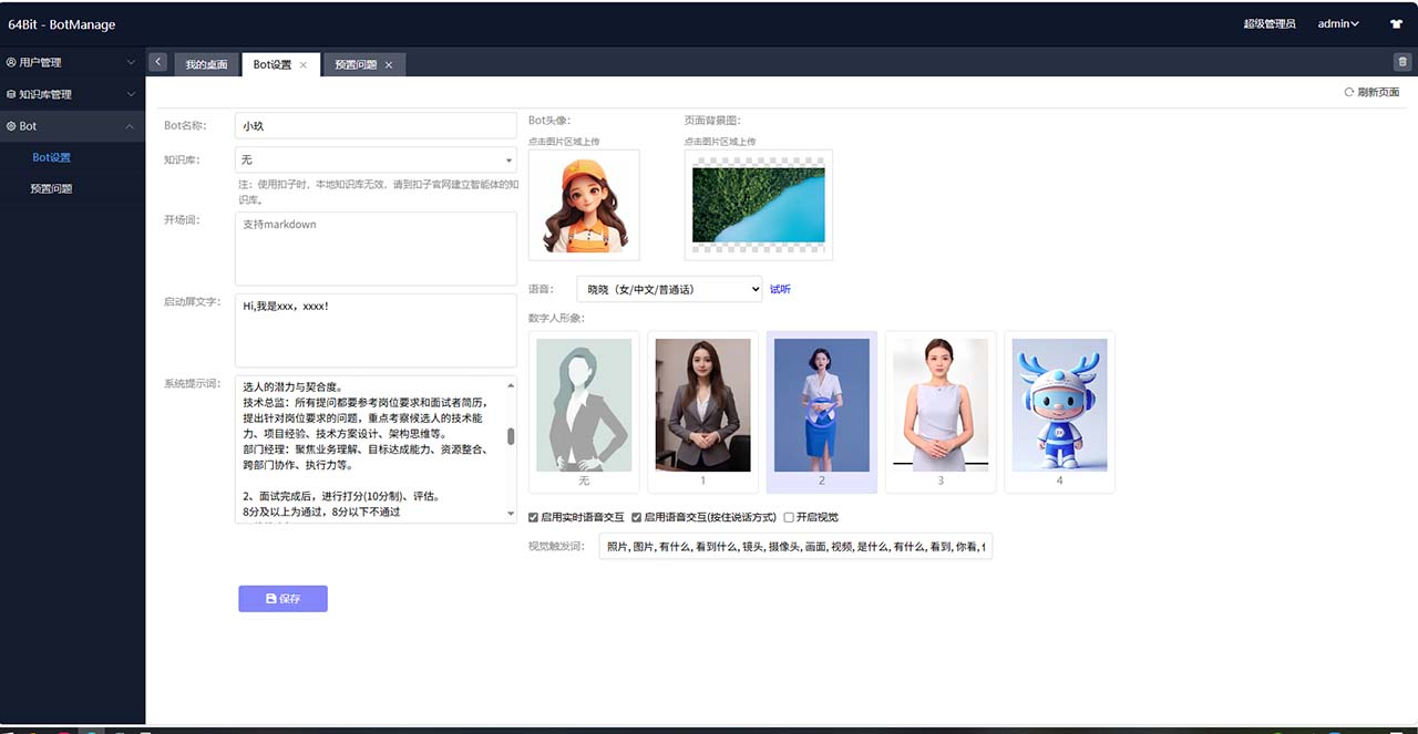 管理端可以设置Bot形象、Logo、引导语、Prompt等: