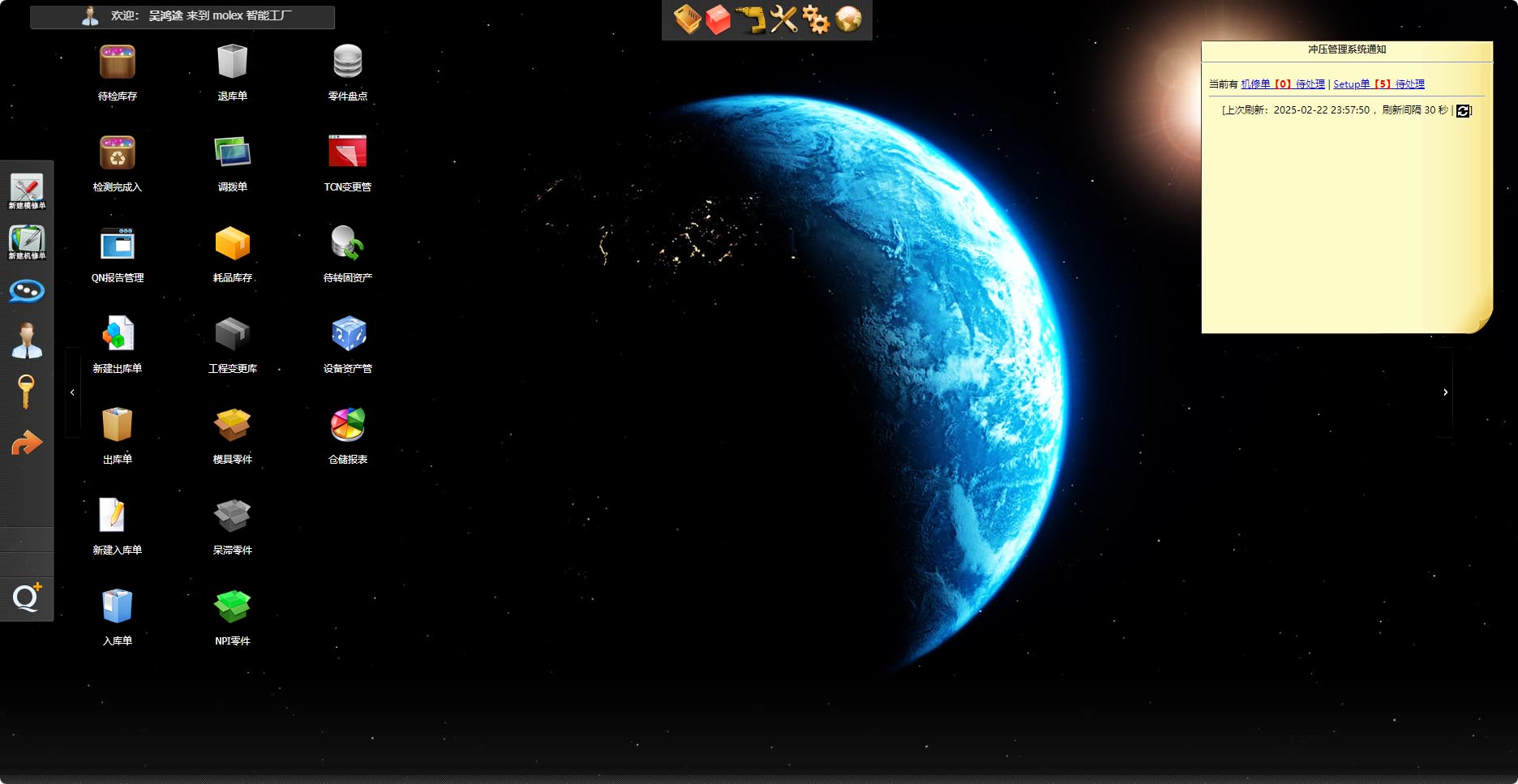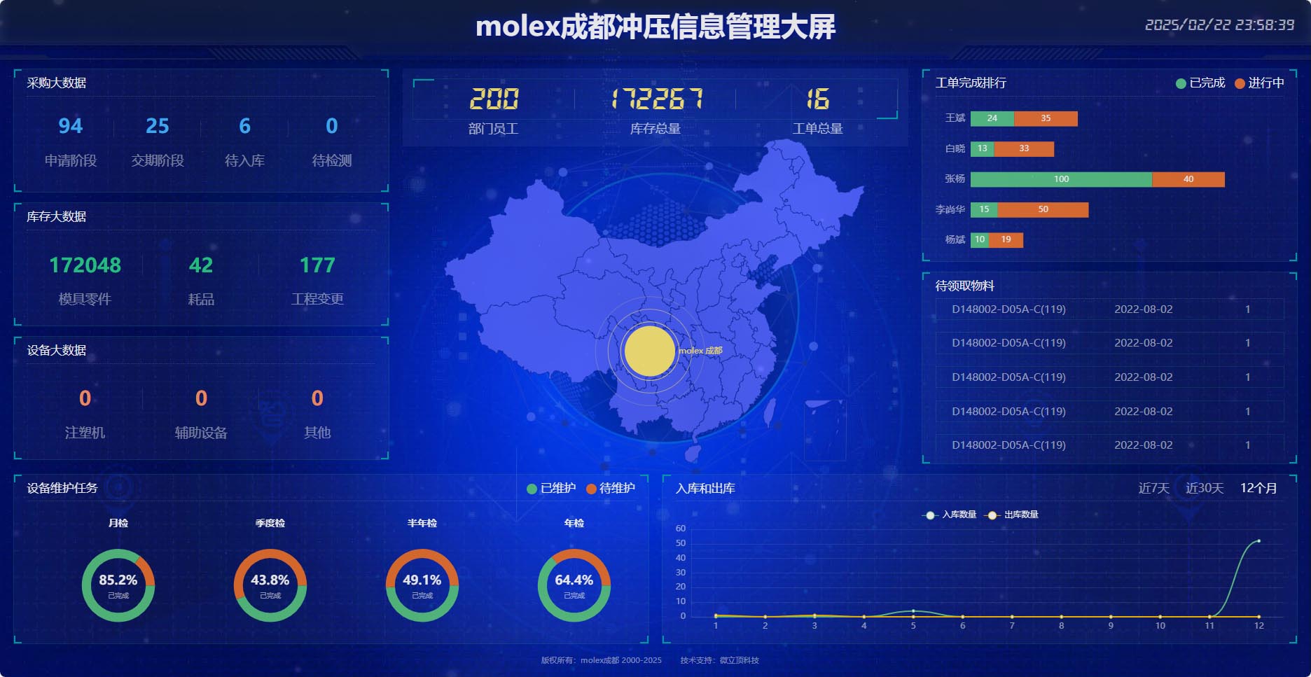 冲压系统数据大屏效果Demo,主要包括了库房那里的出库列表展示、工单完成比例、MD设备多维度数据等,以及整个部门的综合数据大屏展示