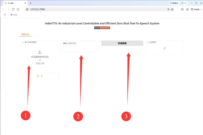 ①上传一段想要克隆音色的参考音频,②上传文案。③生成语音即可