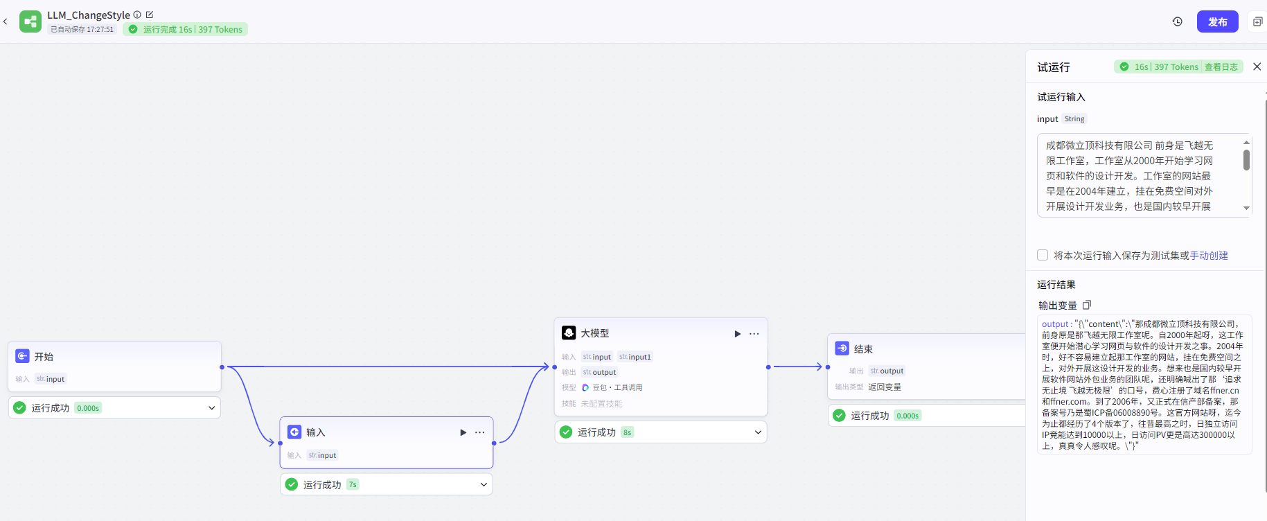 Coze智能体:原始文案二创工作流,通过开始节点提供原始文案,通过输入节点提供风格要求,然后得出新风格的文案