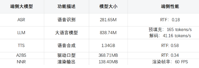 首先,为了实现端侧的实时对话,需要将 ASR(自动语音识别)、TTS(文本转换语音)和 A2BS(口型驱动)的综合 RTF(Real Time Factor,实时因素)控制在 1 以内,即能在 1 秒内生成 1 秒长度的语音,RTF 值越小生成速度越快。通过持续优化,我们取得了以下突破: