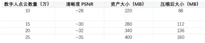 通过相同素材重建得到的数字人模型,在不同高斯点云数量下,会呈现出不同的清晰度、模型体积和渲染性能。为了找到最佳的平衡点,我们进行了多种不同点云数量模型的测试: