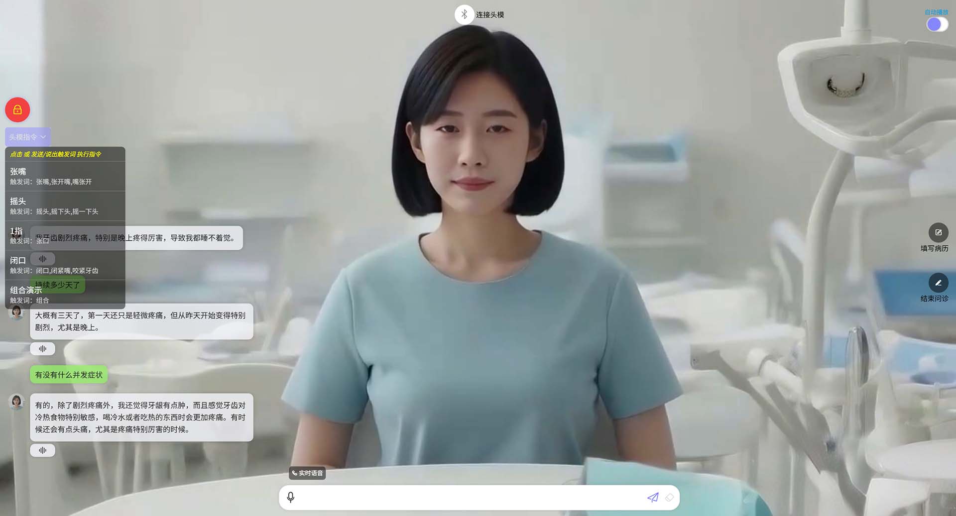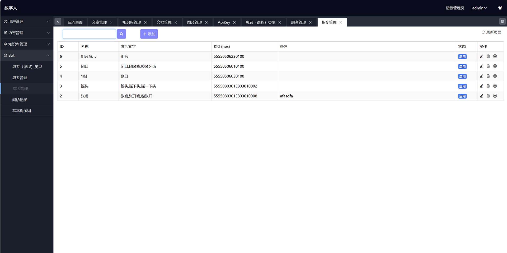 支持蓝牙调度舵机的AI医学教培数字人,可以实现数字人形象管理、人设管理、知识库管理,支持流式对话、对讲机式对话、文字对话,支持考评打分和评价等,支持自定义命令控制舵机动作等。