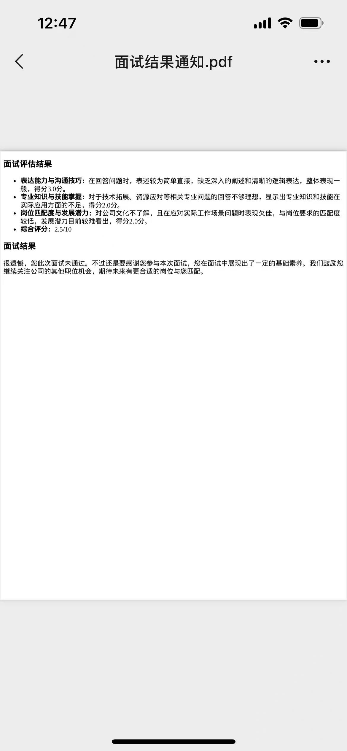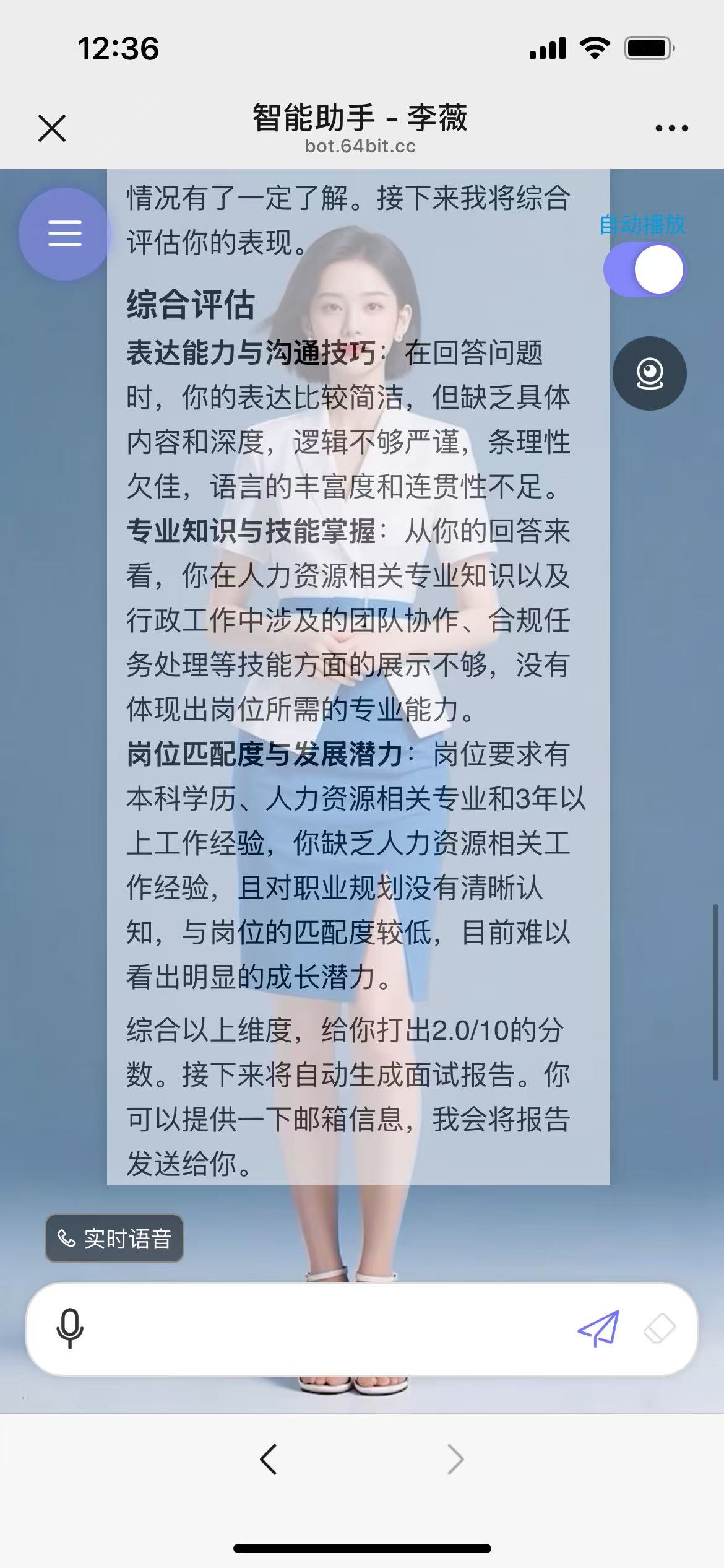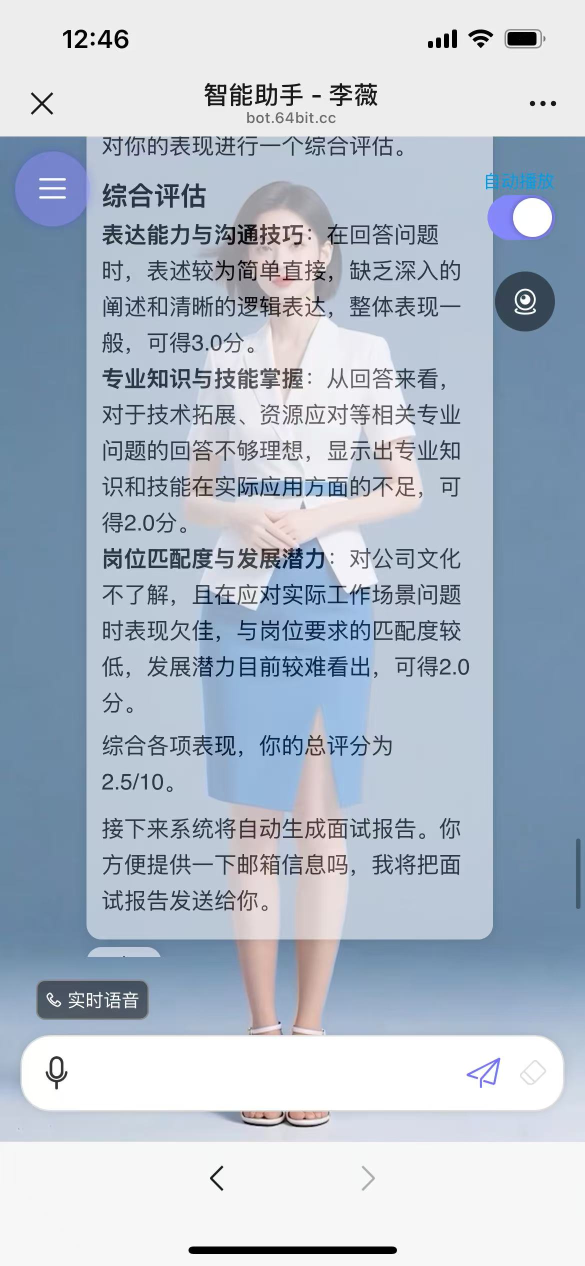 基于Coze智能体的AI面试效果,可以根据语料提供的岗位信息,选择不同面试官角色,和用户进行多维度的面试,并且给出点评、分值和反馈结果。