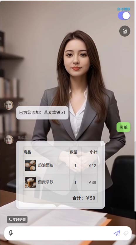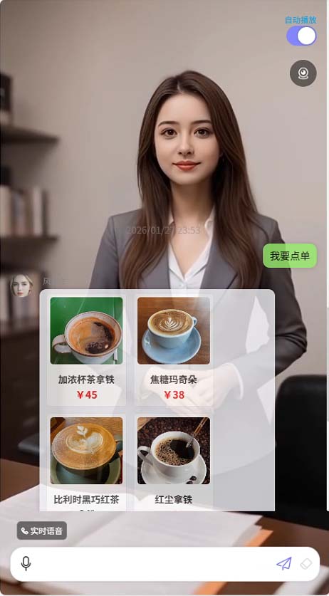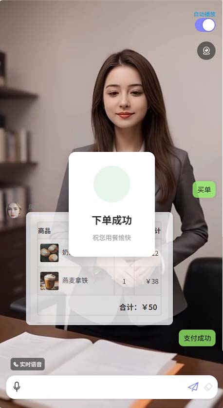 实时数字人交互点餐Demo,分为启动、点餐、查看订单、删除订单、支付结束几个节点。