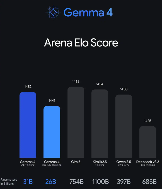 按照过去两年的直觉,这个参数规模几乎不在第一梯队。开源世界里,动辄就是百亿、千亿,甚至像 DeepSeek V3.2 这种 600B+ 级别的模型,才有资格谈「对标闭源」。但 Gemma 4 的这两个模型,上来就把这套逻辑打乱了。