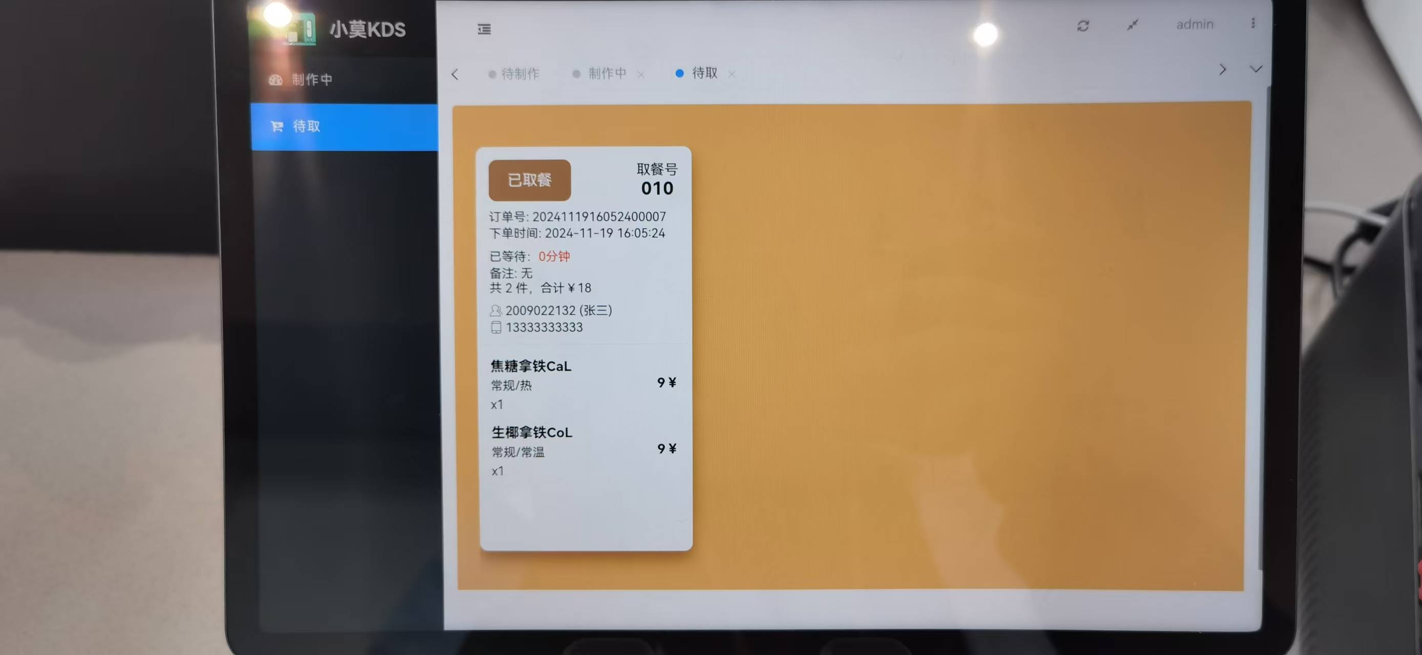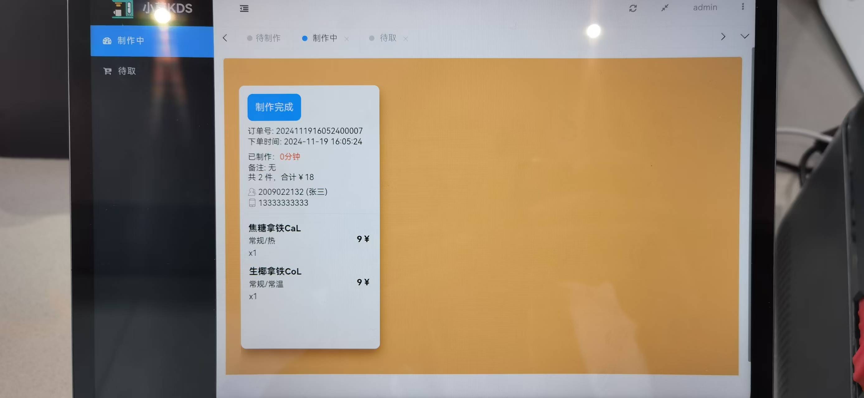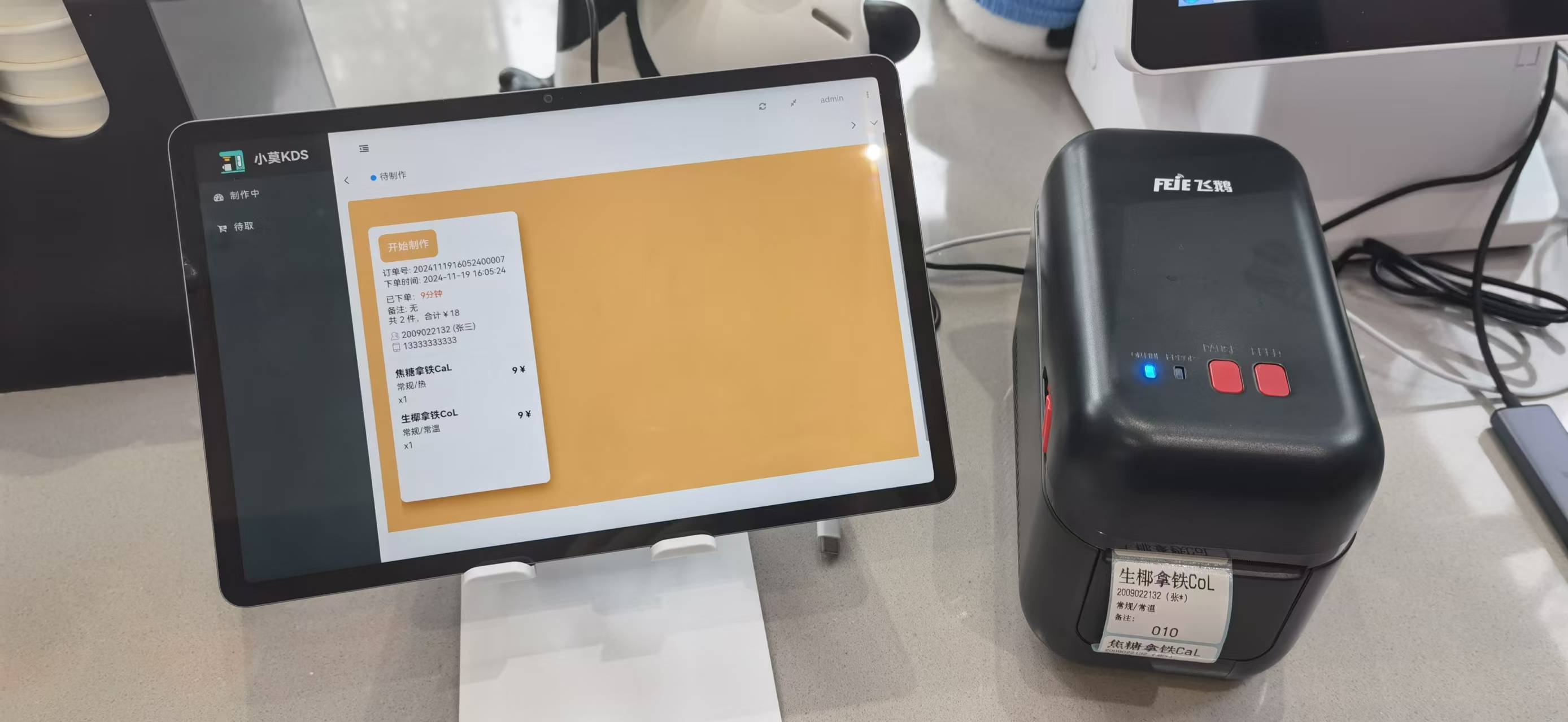 KDS端 是当员工下单后,前台自动接收下单信息,同时标签打印机和小票打印机打印商品信息和小票信息。前台人员确认接单后,单据转到制作中,同时微信消息推送到员工手机端;前台人员确认完成后,单据转到待取餐,同时微信消息推送到员工手机端。员工取餐完成,标记成取餐完成状态,完成整个闭环。