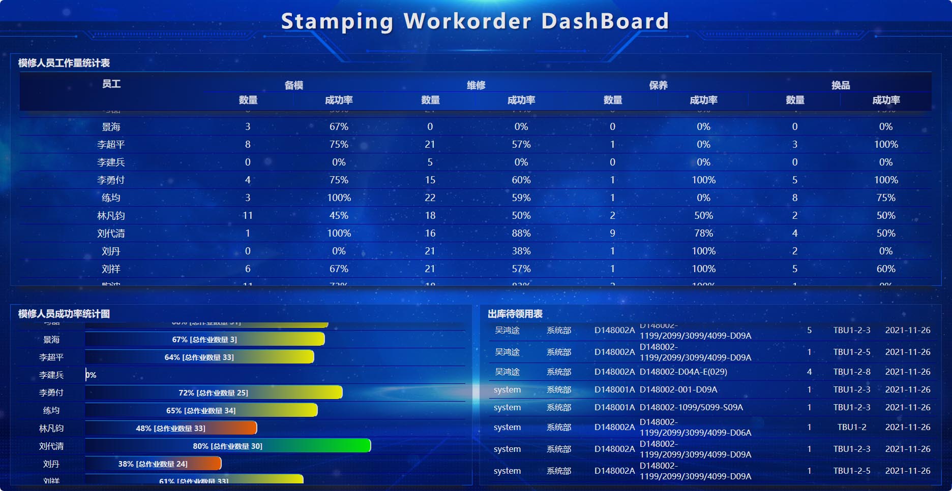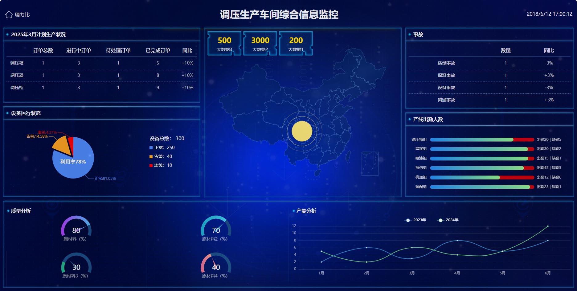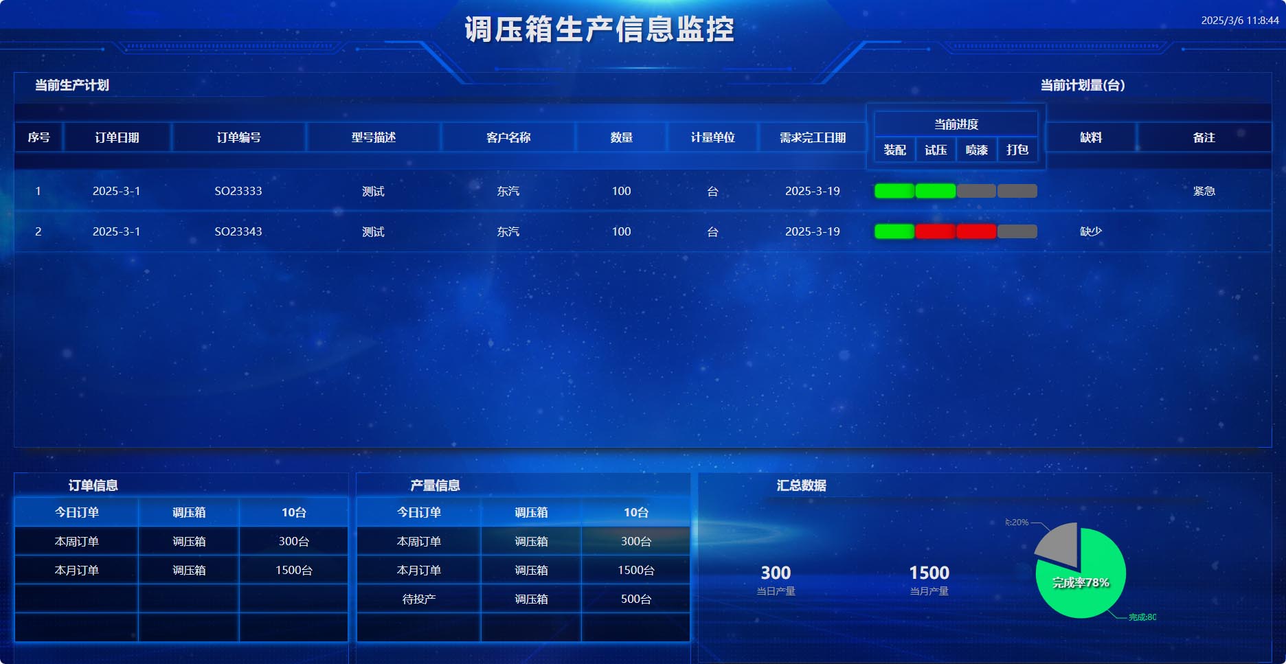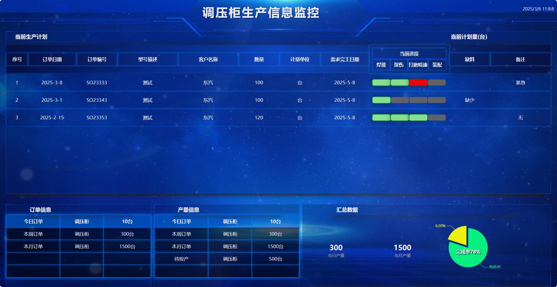工厂数据大屏主要用于显示库房的出库单情况、工单情况、设备维护情况、生产产品工序进度、产量产值等,直观明了的展示各个维度的数据。