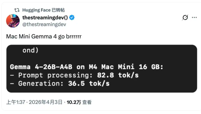 Gemma 4 推出后,X 上就有独立开发者就在 RTX 5090 上本地部署了 31B,不仅能快速完成代码生成、多模态理解任务,整体表现已经相当可用。至于 Gemma 4(26B),在 Mac mini(M4 16GB)上就能很好地部署运行 。