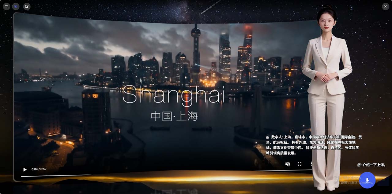 支持视频内容播报、网页内容显示播报,关联知识库,支持音色克隆,背景支持图片、视频、摄像头实时画面、网页等,人物支持位置拖拽,自动补齐影子等