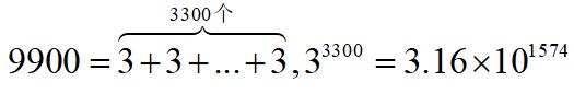 现在,你要把9900拆成一大堆正整数的和,让它们的乘积最大,那么应该拆成3300个3,它们的乘积最大: