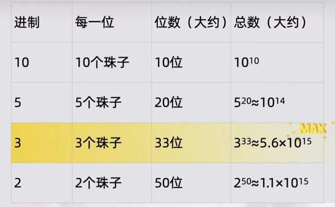 你会发现:同样用100个珠子,使用3进制——每根柱子上串3个珠子,表示33位,效率是最高的,它能表示出最多的数字!
