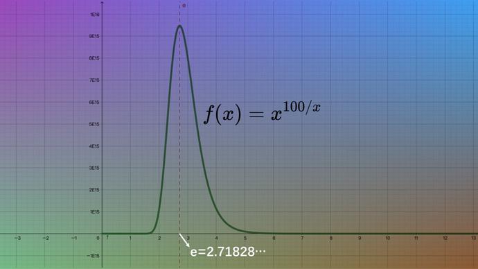 我们还可以把进制x作为横坐标,把100个珠子在这种进位制下能表示的数作为纵坐标,画出一幅图,你会发现,在进位制是e=2.71828…时表示的数最多!这个数就是自然常数e!它是一个和圆周率π一样神奇的无理数!