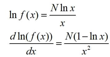 其实,这是一个函数极值问题。我们要将一个整数N拆成几个x的和,显然可以拆出N/x个数。把它们乘起来,乘积函数f(x)可以写作: