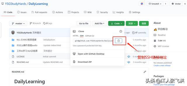 克隆GitHub中的存储库: 1、复制GitHub存储库的SSH链接地址: