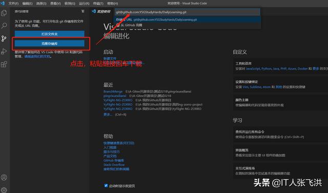2、打开VS Code点击克隆,粘贴SSH链接地址进行下载: