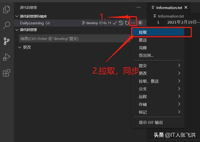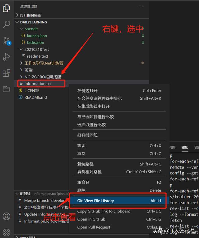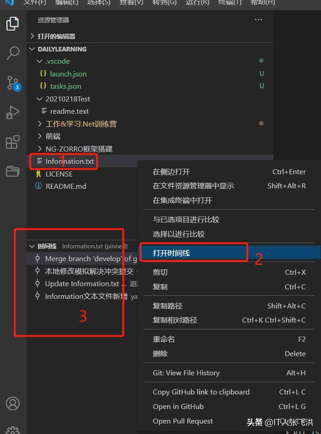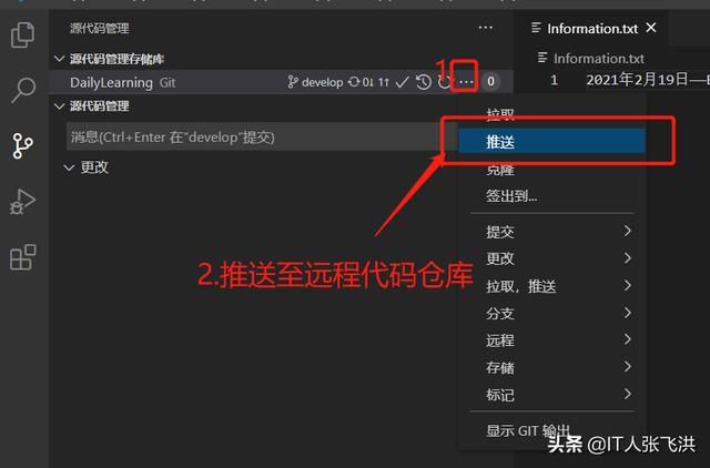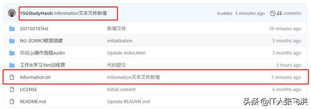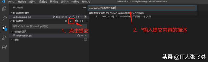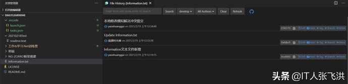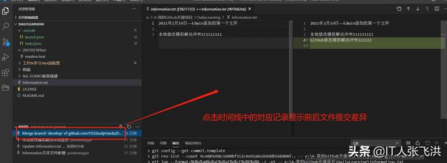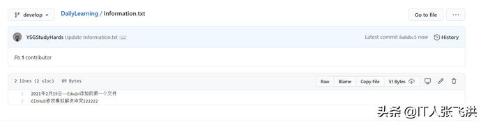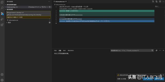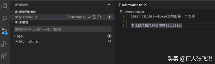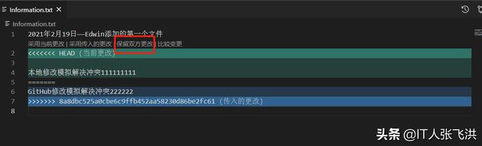 接下来我们来自己模拟一下多人开发,如:我在本地修改Information.txt文本文件的内容,然后在到GitHub中修改一次这样本地在提交的时候就会产生冲突,然后我们可以借助VS Code智能的解决冲突的方式帮助我们来解决冲突。