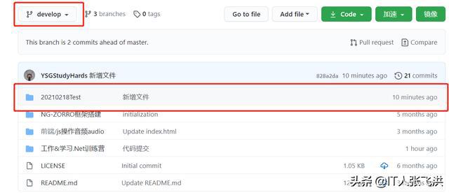 首先我们在feature-20210218子分支中创建一个文件夹和一个文本文件,然后将feature-20210218子分支合并到develop开发分支中合并提交到远程代码库。