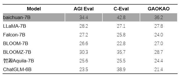 baichuan-7B不仅在C-Eval、AGIEval和Gaokao中文权威评测榜单上,以显著优势全面超过了ChatGLM-6B等其他大模型,并且在MMLU英文权威评测榜单上,大幅领先LLaMA-7B。目前baichuan-7B大模型已在Hugging Face、Github以及Model Scope平台发布。baichuan-7B在C-Eval、AGIEval和Gaokao三个最具影响力的中文评估基准进行了综合评估,并且均获得了优异成绩,它已经成为同等参数规模下中文表现最优秀的原生预训练模型。在中文C-EVAL的评测中,baichuan-7B的综合评分达到了42.8分,超过了ChatGLM-6B的38.9分,甚至比某些参数规模更大的模型还要出色。在AGIEval的评测里,baichuan-7B综合评分达到34.4分,远超LLaMa-7B、Falcon-7B、Bloom-7B以及ChatGLM-6B等其他开源模型。在GAOKAO评测中,baichuan-7B的综合评分达到了36.2分,显著领先于同参数规模的各种其他预训练模型。